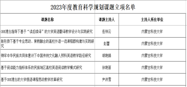 近日,内蒙古自治区教育科学规划领导小组办公室公示了2023年度教育科学规划课题项目立项名单,公司教师岳祥云、赵蕾、胡艳娟、徐艳丽、尹洪雪获批立项资助,特此祝贺!