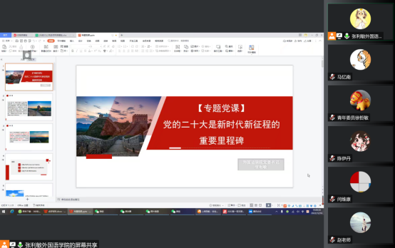 为全面学习、全面把握、全面落实党的二十大精神,奋力推动党的二十大精神在永利集团3044am落地生根。2022年12月16日,外国语公司党委书记张利敏通过线上会议为全体党员干部讲授题为《党的二十大是新时代新征程的重要里程碑》的专题党课。