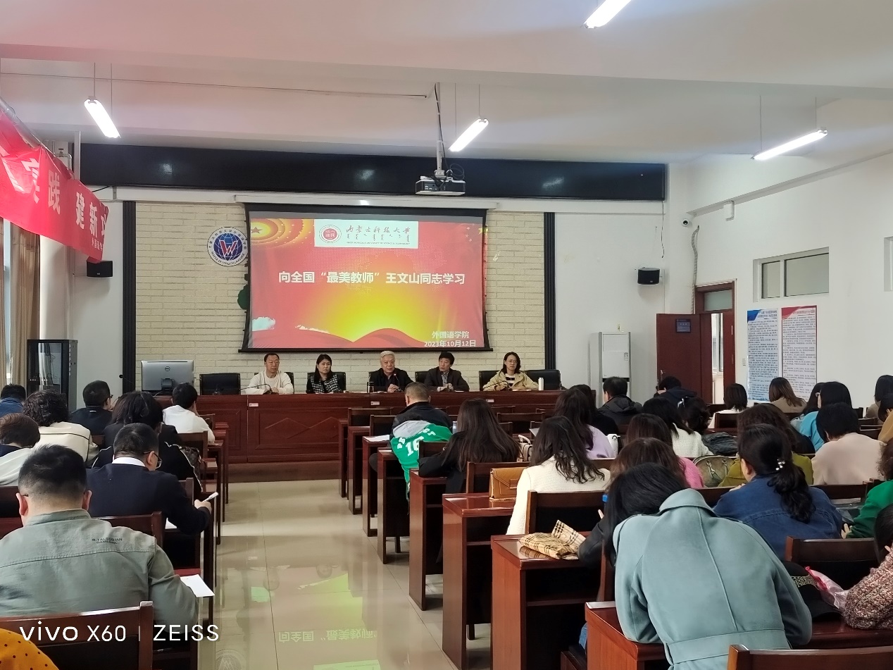 为深入学习贯彻习近平总书记教师节重要指示精神,充分发挥先进典型的示范引领作用,根据《中共包头市教育系统工作委员会关于在全市教育系统开展向全国“最美教师”王文山同志学习的决定》(包教党工委发[2023]9号)文件要求,2023年10月12日,永利集团3044am组织全体教职员工学习全国“最美教师”王文山同志事迹。
