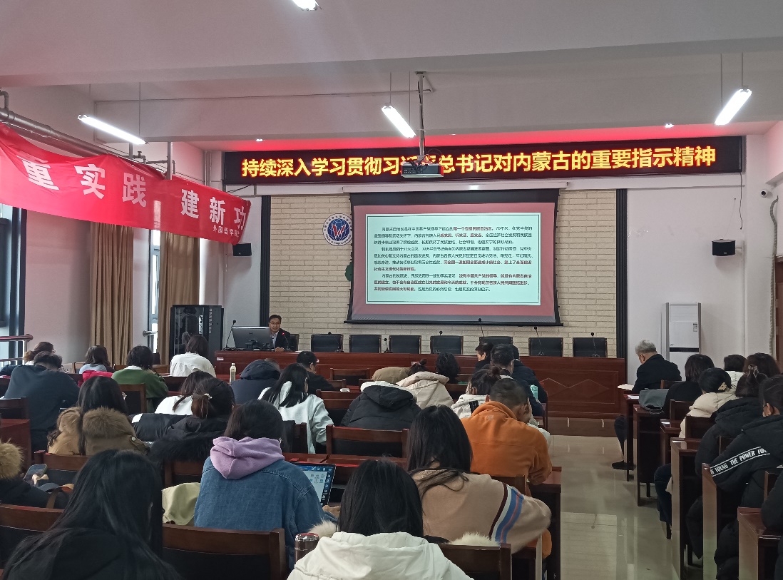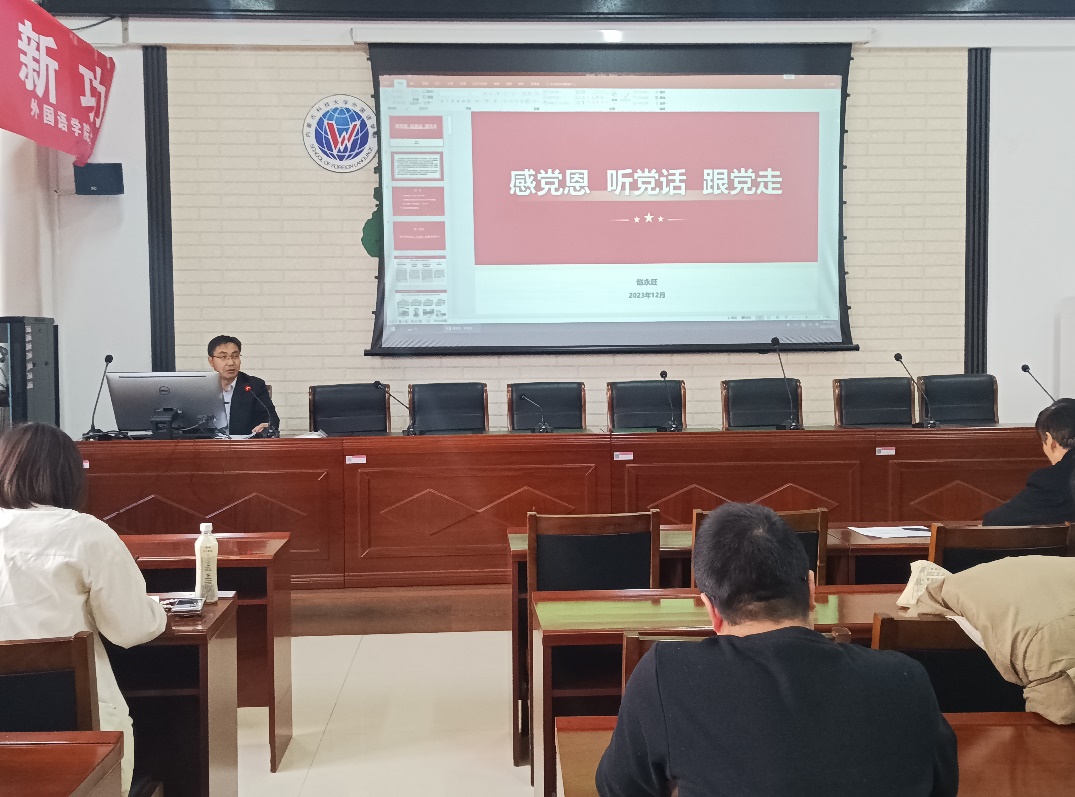 为持续深入学习贯彻习近平总书记对内蒙古的重要指示精神,按照上级关于开展“感党恩、听党话、跟党走”主题宣讲工作的安排,2023年12月12日,外国语公司党委在明德楼A205组织全体教师和员工进行全员政治理论学习。公司党委委员、副董事长赵永旺作题为“感党恩、听党话、跟党走”主题宣讲。