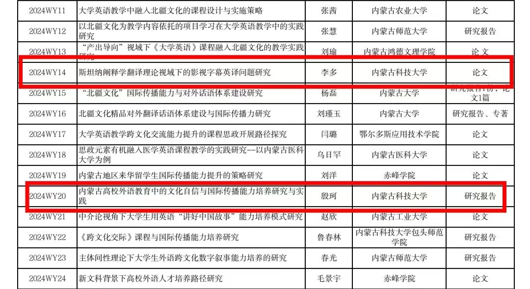 公司教师获批内蒙古社科基金2024年度外语专项 近日,内蒙古自治区社会科学界联合会公布了内蒙古自治区社会科学基金2024年度项目(部分)立项名单,公司教师李多、殷珂获批2024年度外语专项立项资助,特此祝贺! 永利集团3044am学科办 2024年5月23日