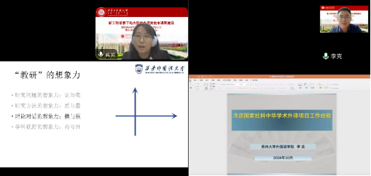 会议分为两个阶段,第一阶段苏州大学特聘教授、博士生导师、博士后合作导师李克教授以“浅谈国家社科中华学术外译项目工作经验”为题、以个人申报中华学术外译项目为例,介绍了项目申报的选题、预报选题、申请以及出版社授权等流程及注意事项。西安外国语大学副教授,北京外国语大学博士苏芳以“大学英语教师科研成长路径”为题,分享了大学英语一线教师的教科研成长经验。
