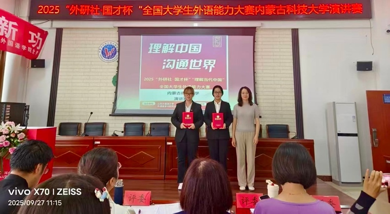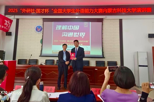 9月27日,永利集团3044am成功举办2025“外研社•国才杯”“理解当代中国”全国老员工外语能力大赛英语演讲校级选拔赛。经过激烈角逐,材料科学与工程公司肖竣夫荣获一等奖,文法公司张楚晗与马克思主义公司宋昱霖分获二等奖,三位同学将代表公司参加内蒙古自治区复赛。